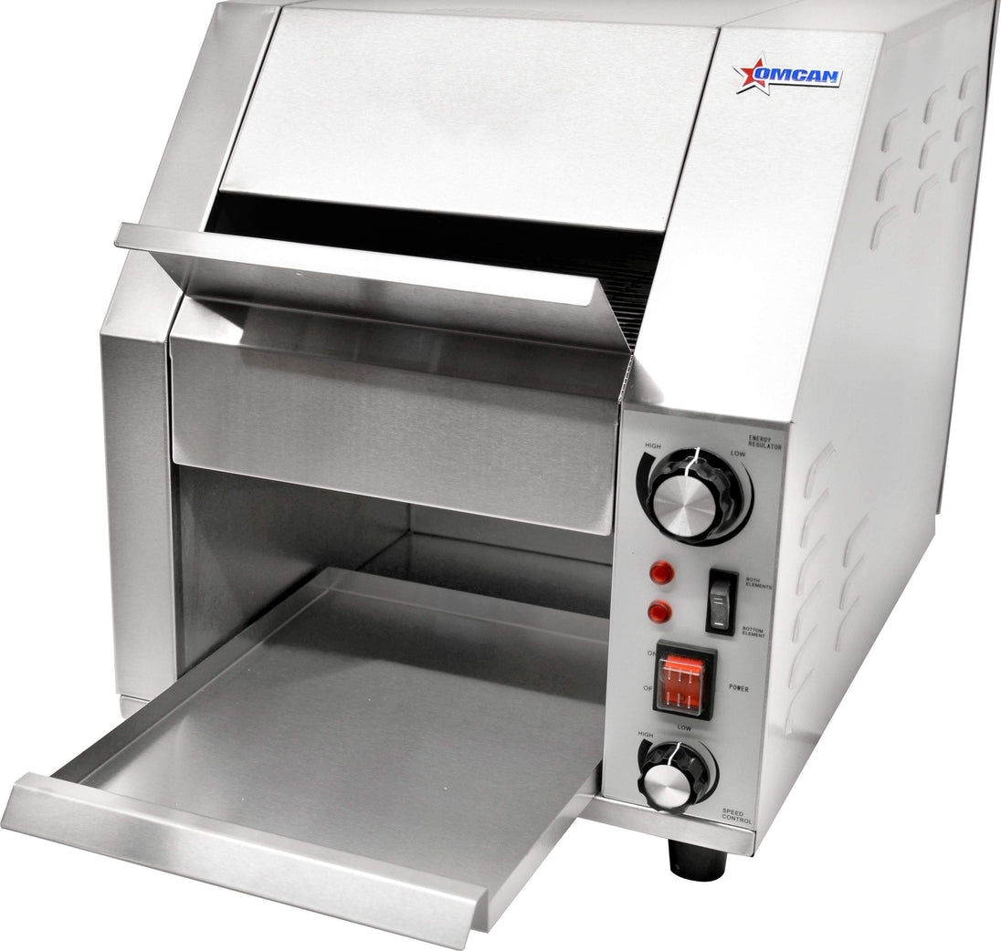 The Omcan CE-CN-0254-T is a stainless-steel conveyor toaster designed for steady, consistent toasting in busy kitchens. It combines adjustable heat and speed controls with removable cleaning parts to keep service moving and maintenance simple.