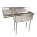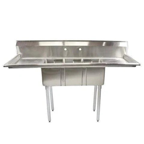 This compact, three-compartment sink is built for busy kitchens that need full functionality in a smaller footprint. Each compartment measures 10" x 14" x 10" and the unit is available with drainboards on both sides, one side, or without drainboards. It includes a center drain and meets CSA standards for commercial use.